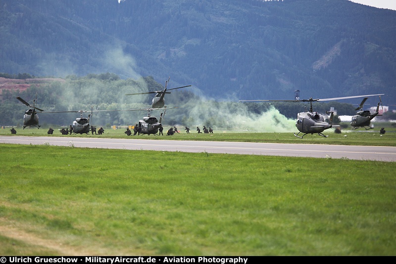 The following pictures showing further details of the excercise. ![]() ![]() 1. Paratroopers from the 25th Infantry Bataillon, 7th Infantry Brigade based at Klagenfurt jumping out of Lockheed C-130K Hercules transport aircraft over the airfield to infiltrate the area. - aircraft: Lockheed C-130K Hercules ![]() ![]() 2. Combat-, surveillance-, and transport helicopters from several Austrian Air Force Flight Regiments arriving over the landing zone. - helicopters: Bell OH-58B Kiowa, Sud SE-3160 Alouette III, Agusta AB-212 ![]() ![]() 3. Special Forces approaching with Sikorsky S-70A Black Hawk helicopters from 1 Flight Regiment (Fliegerregiment 1). - helicopter: Sikorsky S-70A-42 Black Hawk ![]() ![]() 4. Bell OH-58B Kiowa helicopters firing at enemy forces on the ground which are trying to enter the landing zone. The Kiowa helicopters using their GAU-2/A/M134 "Minigun", a 7.62 mm multi-barrel heavy machine gun. - helicopters: Bell OH-58B Kiowa ![]() ![]() 5. The helicopters leaving the airspace and soldiers on the ground preparing the landing zone for the evacuation. After that a Hercules transport aircraft is cleared to land at the secured airfield. ![]() 6. Pandur I armoured personnel carrier equipped with 12.7 mm (.50 cal) heavy machine guns escorting the compatriots to the holding transport aircraft. ![]() 7. People boarding the aircraft covered by the armoured personnel carrier and special surveillance and reconnaissance soldiers (foreground). - aircraft: Lockheed C-130K Hercules ![]() 8. Austrian Special Forces soldiers using the Special Patrol Insertion & Extraction System (SPIES) to quickly evacuate the landing area. - helicopter: Sikorsky S-70A-42 Black Hawk [ TOP ] |