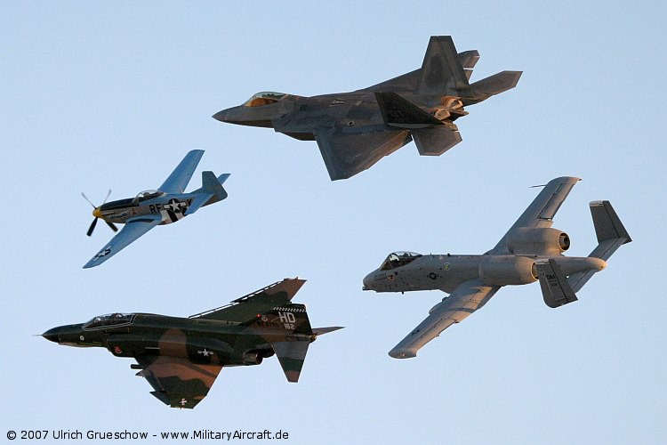 Lockheed Martin F-22A Raptor, North American P-51D Mustang, McDonnell Douglas QF-4E Phantom II
