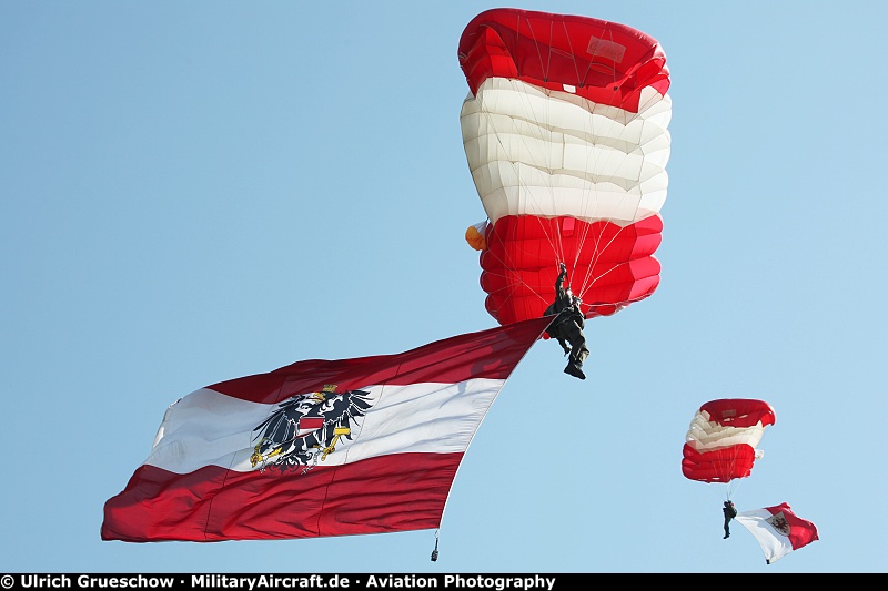 Parachute demonstrations of the HSV Red Bull Salzburg Fallschirmsport, Wals/Salzburg, Austria and the RBST (Red Bull Skydive Team) Flight GmbH, Hard, Austria at Airpower22 Steiermark airshow.