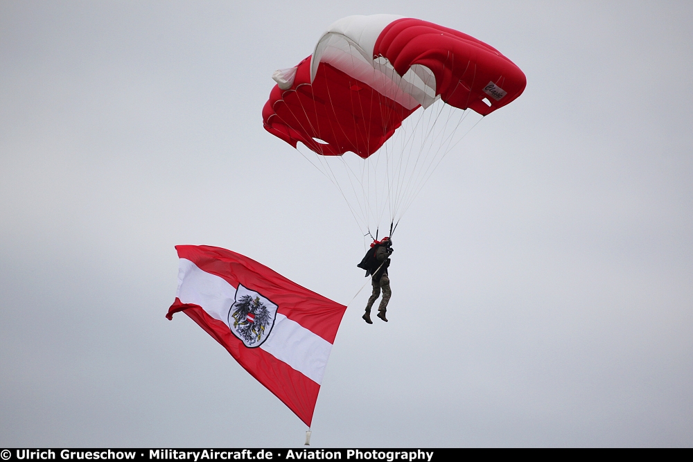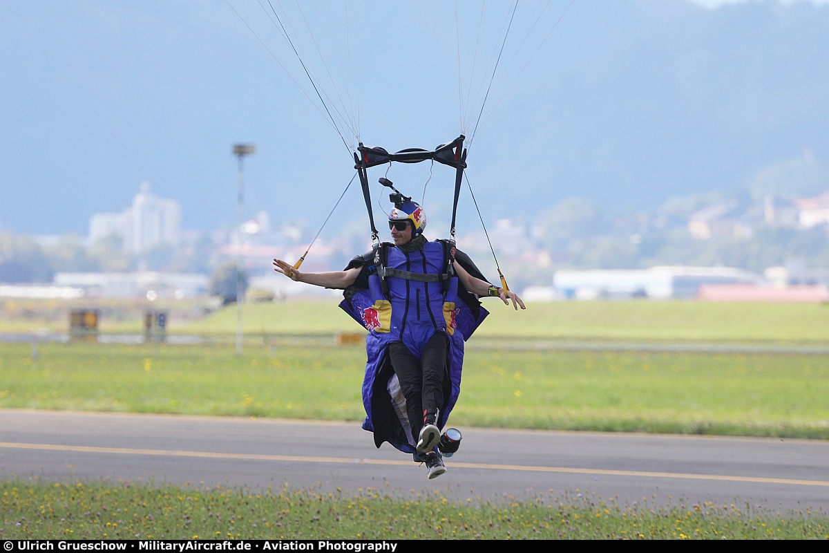 The parachutists of the HSV Red Bull Salzburg Fallschirmsport, Wals/Salzburg, Austria and the RBST (Red Bull Skydive Team) Flight GmbH, Hard, Austria at Airpower19 Steiermark airshow.
